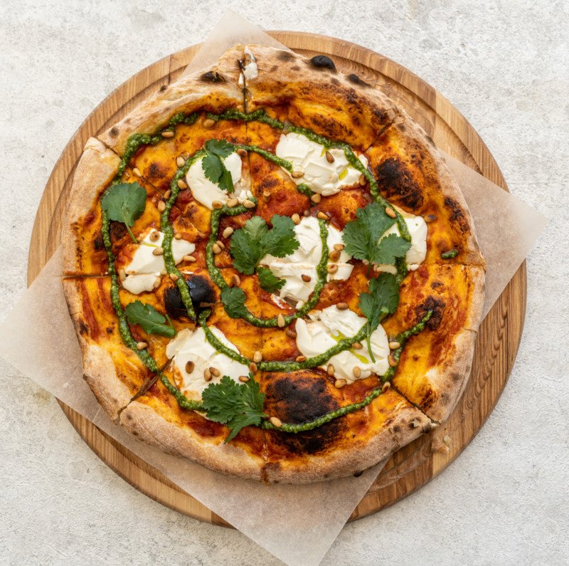 тесто, соус красный, страчателла, орех кедровый, песто соус,