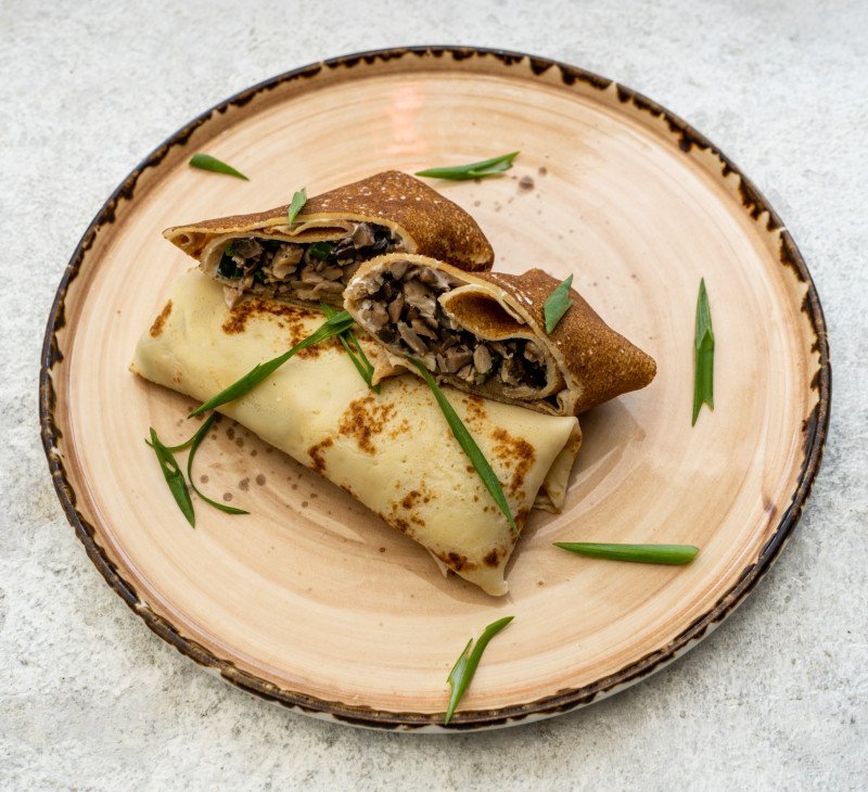 мука, яйцо, молоко, масло растительное, курица, шампиньоны, лук зеленый, сыр плавленный